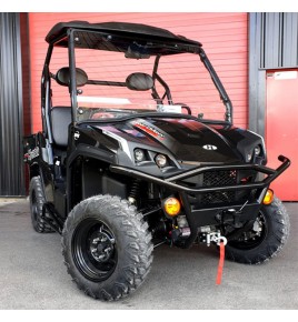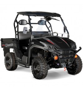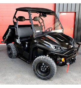 Cet engin est excessivement fourni, en premier lieu, il est équipé de la direction assistée, d’une benne basculante électrique, d’un treuil 1T 360, d’une banquette pouvant accueillir jusqu’à 3 personnes, d’un pare-brise avec essuie-glace de série, d’un attelage agricole avant et arrière et finalement de bavettes de protection roues arrière.