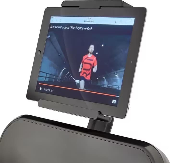 Le tapis inclut un support tablette intégré. Placez votre smartphone ou votre tablette pour suivre un film, une série ou un parcours virtuel. Cela rend chaque séance plus agréable et moins monotone.